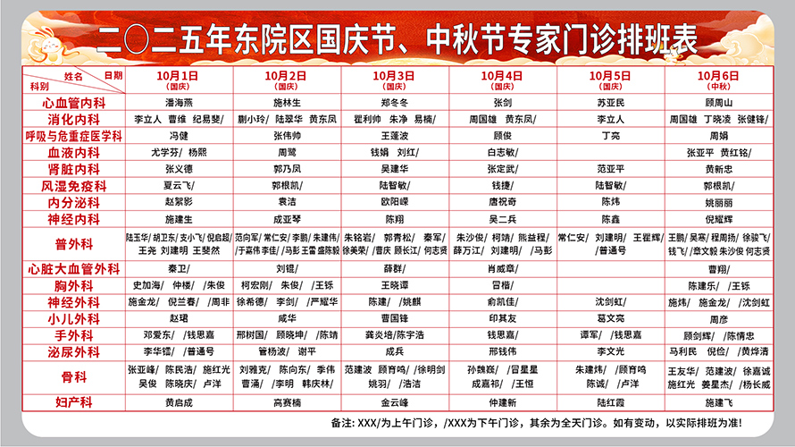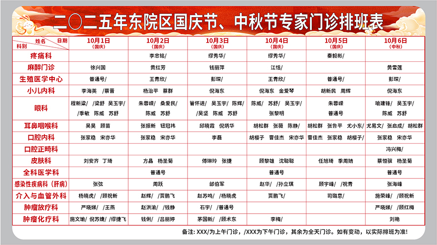 二○二五年十月份东院区国庆节、中秋节专家门诊排班表