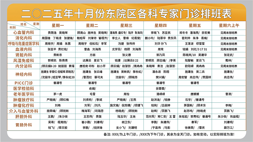 东院区周一至周六上午门诊专家排班
