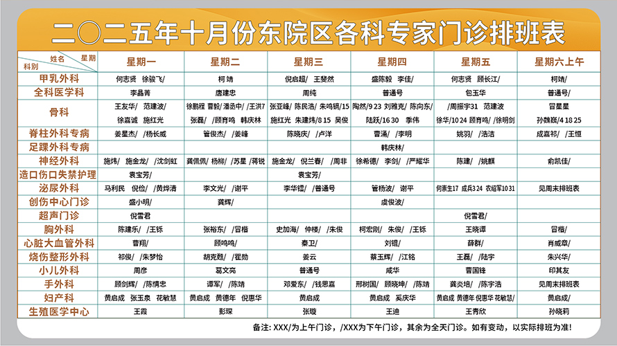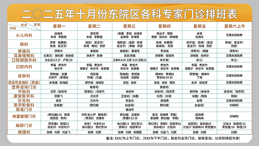 二○二五年十月份东院区门诊排班表(周一至周六上午)