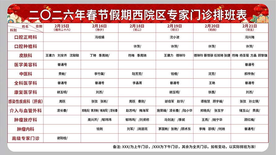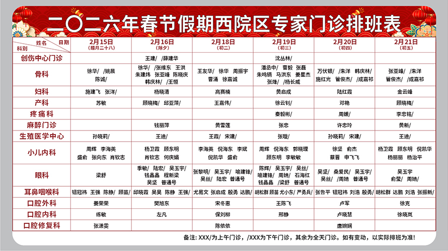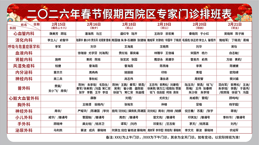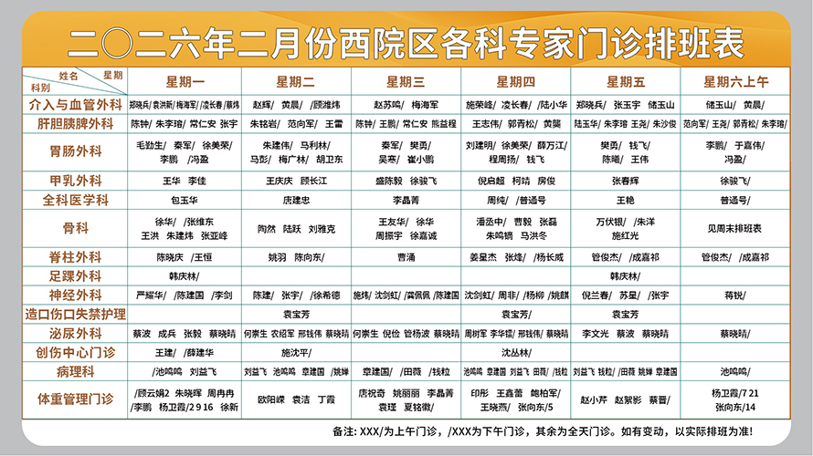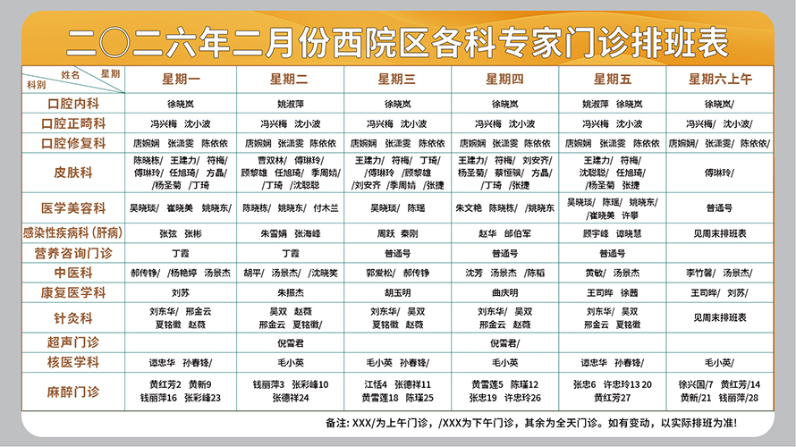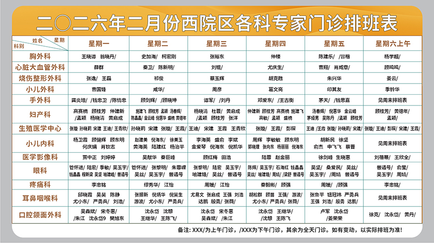 二○二六年二月份西院区门诊排班表(周一至周六上午)