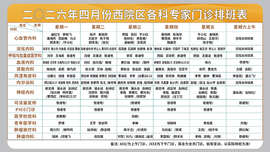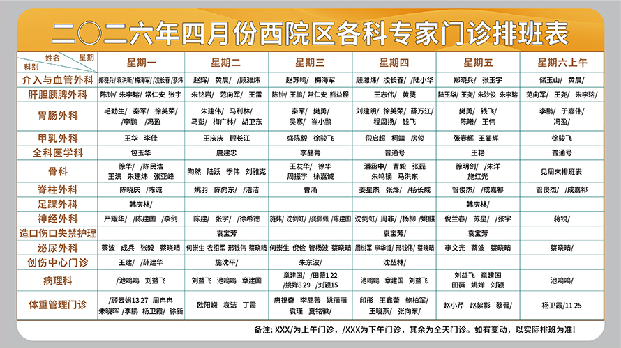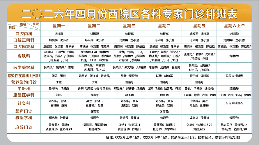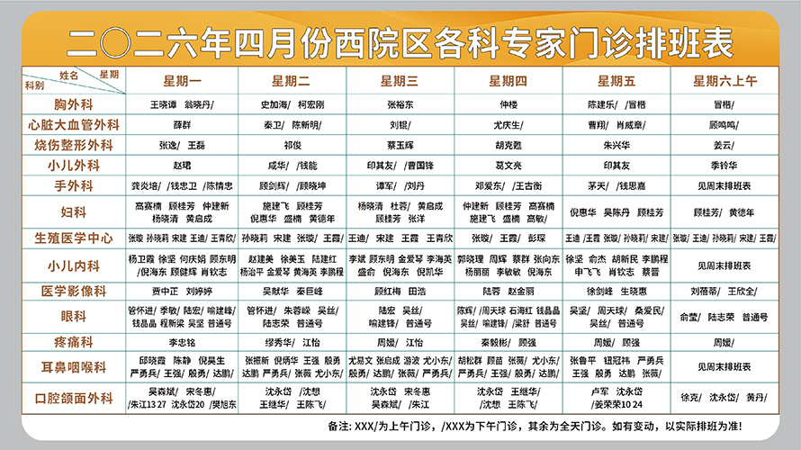 二○二六年四月份西院区各科专家门诊排班表(周一至周六上午)