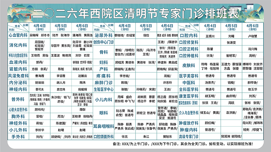二○二六年四月份西院区清明节专家门诊排班表