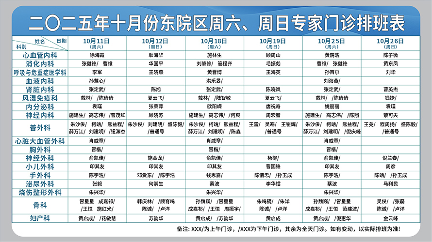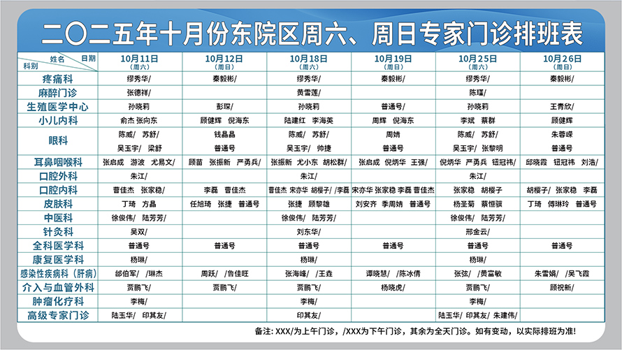 二○二五年十月份东院区周六、周日专家门诊排班表