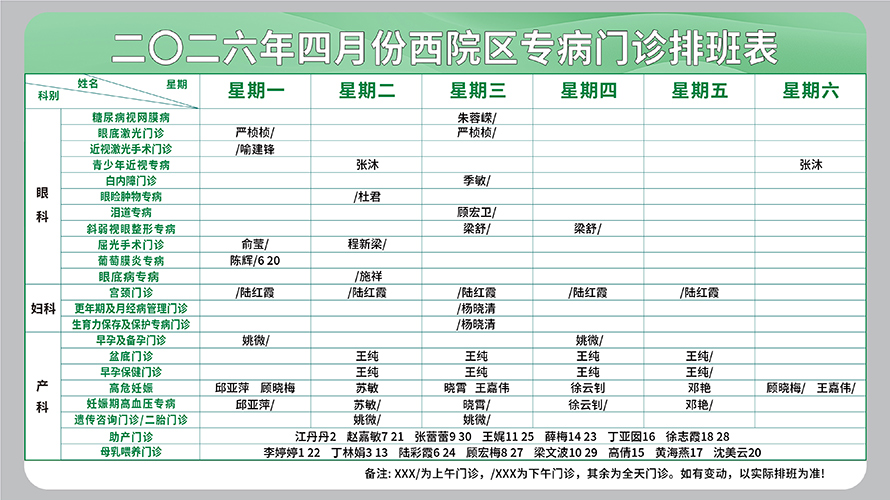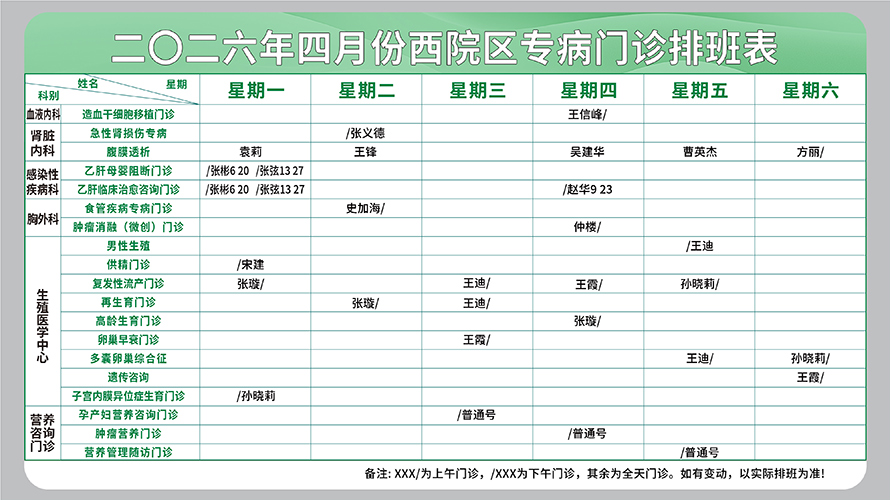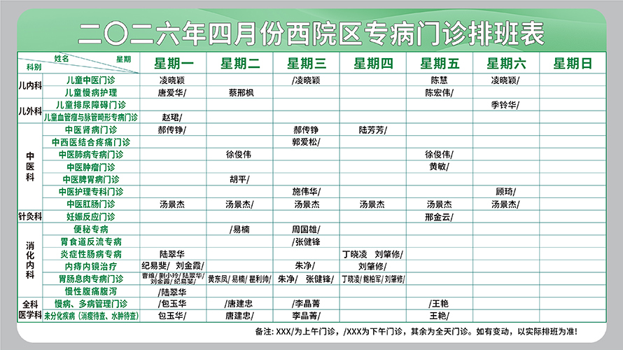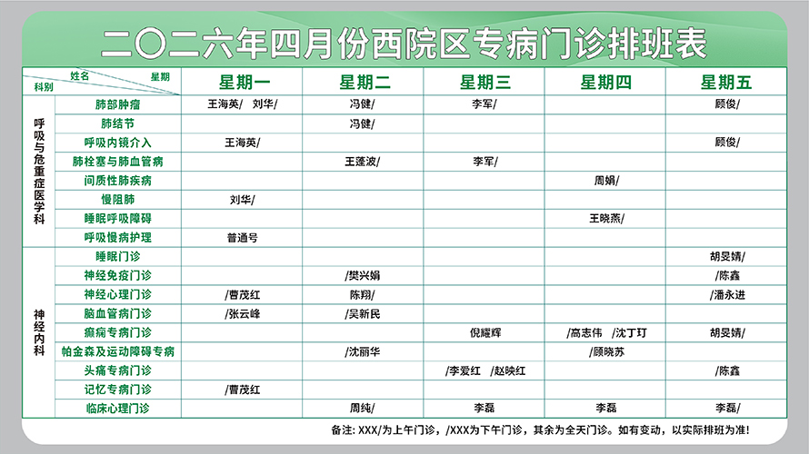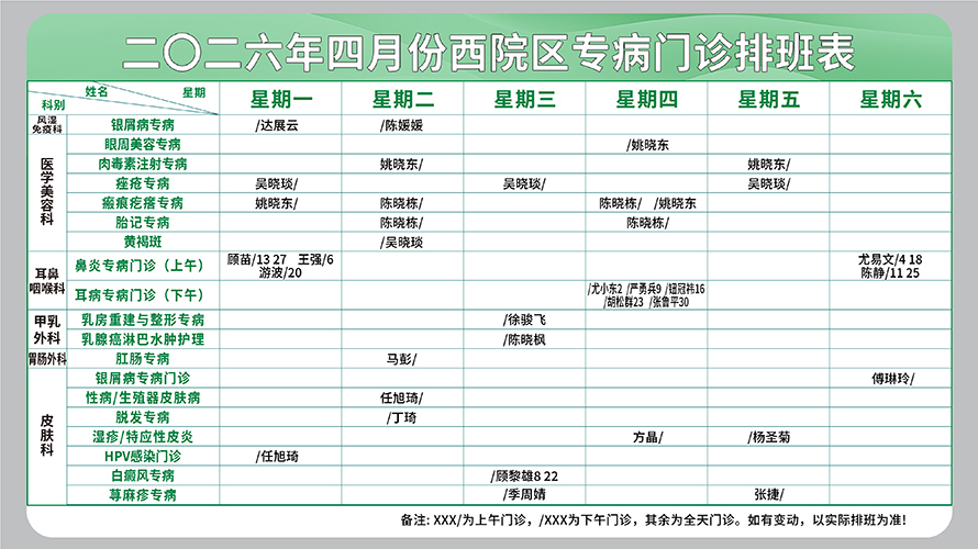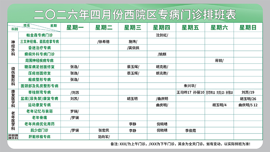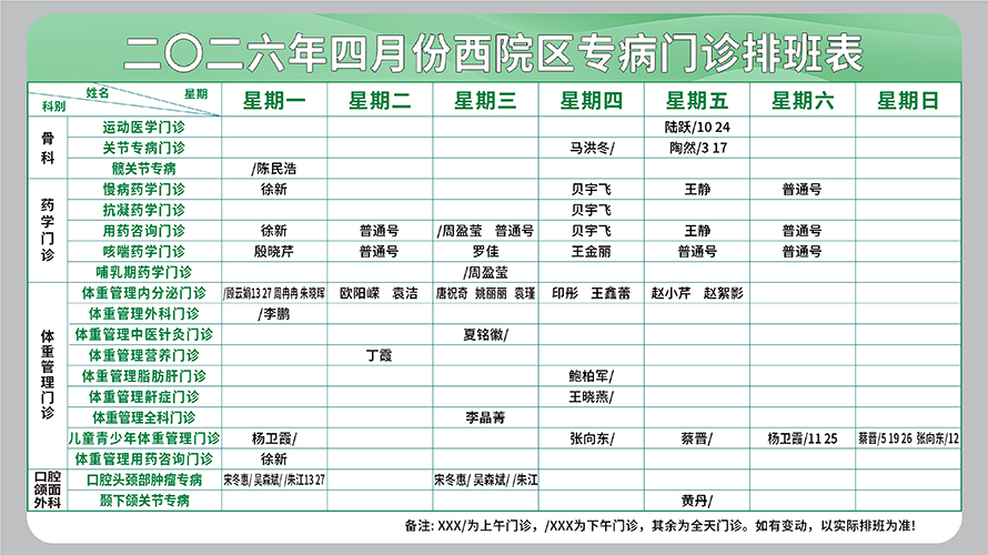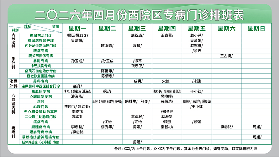 二○二六年四月份西院区专病门诊排班表