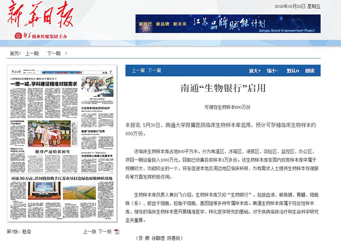 新华日报:南通“生物银行”启用 可储存生物样本600万份