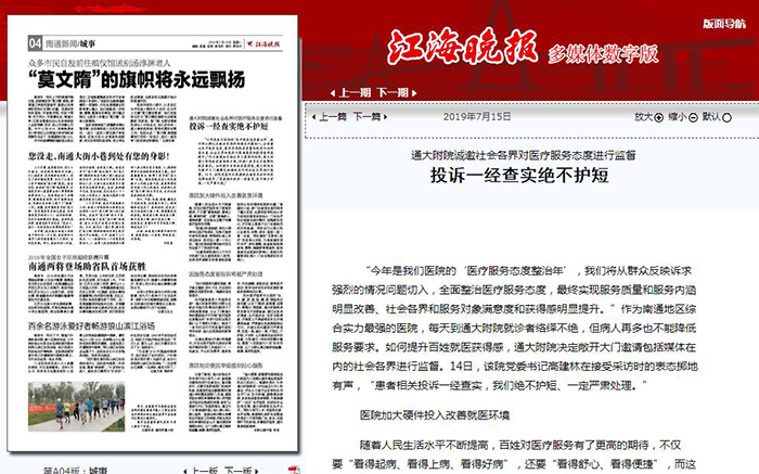 江海晚报:通大附院诚邀社会各界对医疗服务态度进行监督 投诉一经查实绝不护短