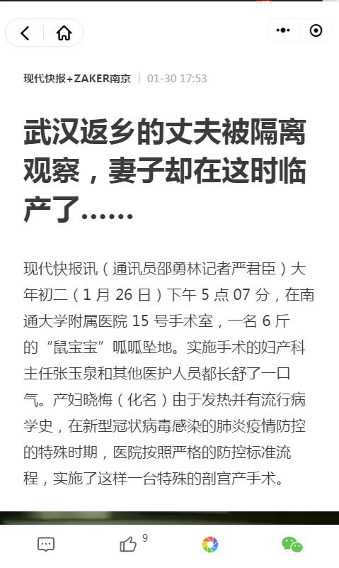 现代快报:武汉返乡的丈夫被隔离观察,妻子却在这时临产了……
