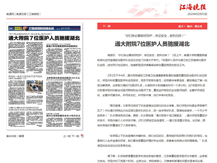江海晚报:“你们务必要做好防护,保证安全,胜利归来!”——通大附院7位医护人员驰援湖北