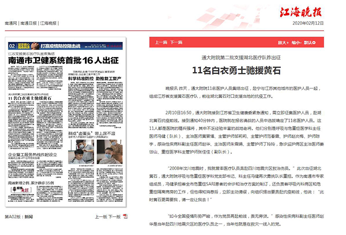 江海晚报:通大附院第二批支援湖北医疗队昨出征