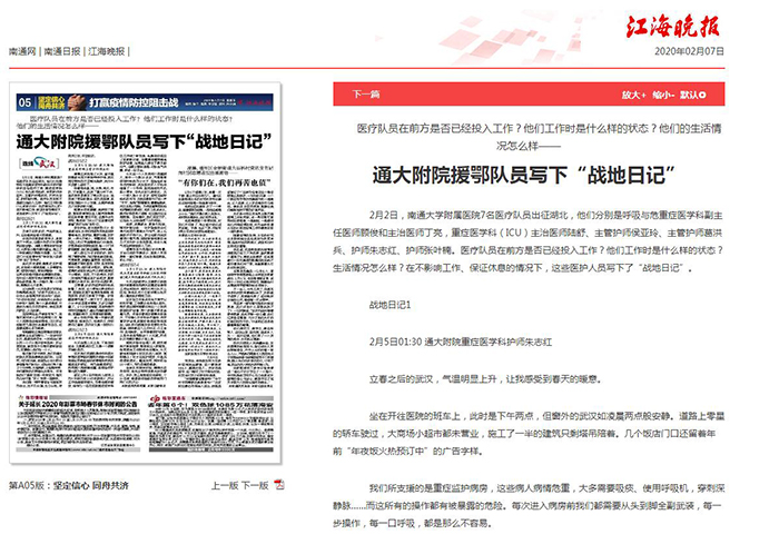 江海晚报:通大附院援鄂队员写下“战地日记”