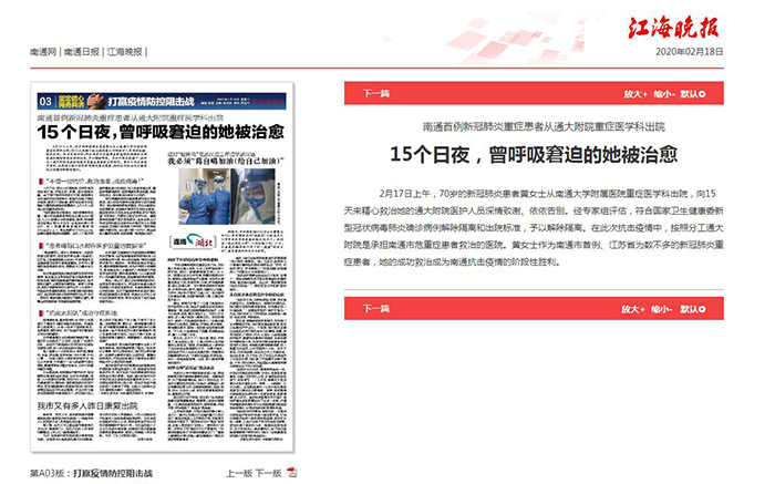 江海晚报:南通首例新冠肺炎重症患者从通大附院重症医学科出院