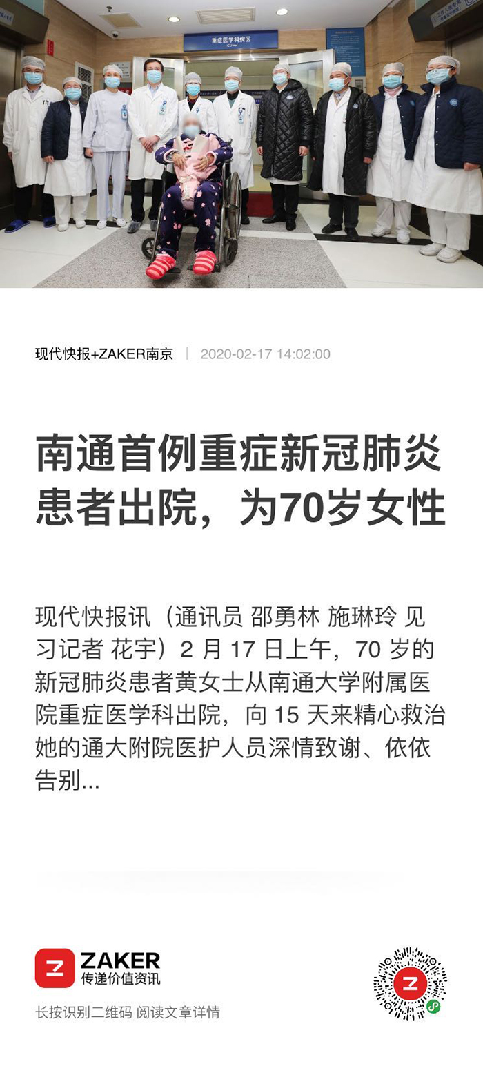 现代快报:南通首例重症新冠肺炎患者出院,为70岁女性