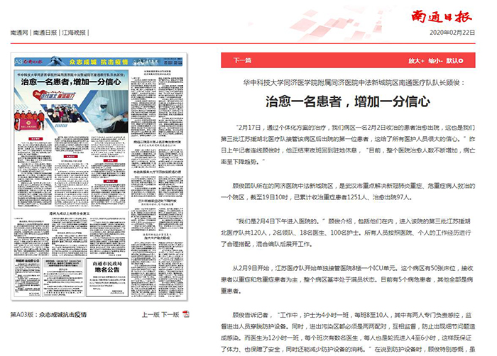 南通日报:中法新城院区南通医疗队队长顾俊——治愈一名患者,增加一分信心