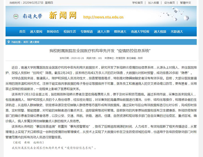 南通大学:我校附属医院在全国医疗机构率先开发“疫情防控信息系统”