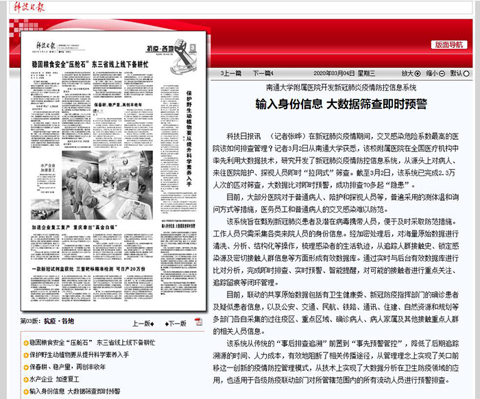 科技日报:南通大学附属医院开发应用新冠肺炎疫情防控信息系统