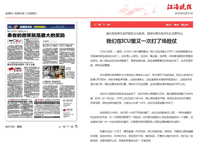 江海晚报:援湖北黄石医疗队队员姜岱山——我们在ICU里又一次打了场胜仗