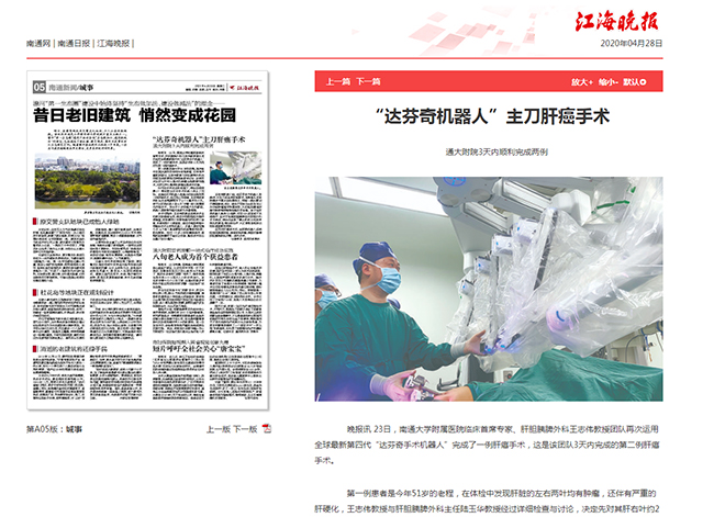 江海晚报:“达芬奇机器人”主刀肝癌手术