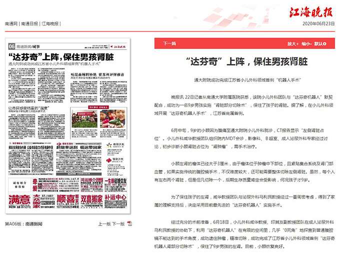 江海晚报:“达芬奇”上阵,保住男孩肾脏