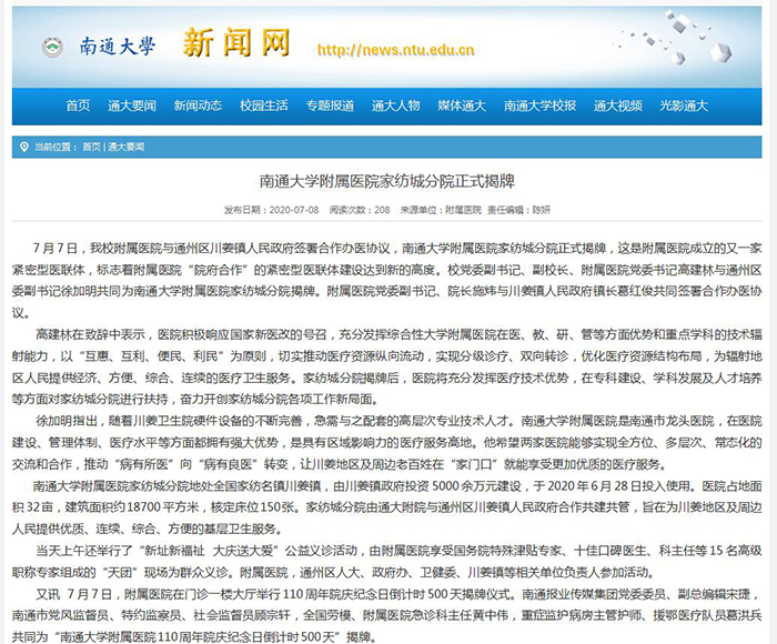 南通大学:南通大学附属医院家纺城分院正式揭牌