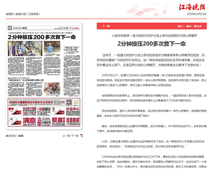 江海晚报:心跳呼吸骤停!通大附院95后护士跳上移动抢救病床开展心肺复苏