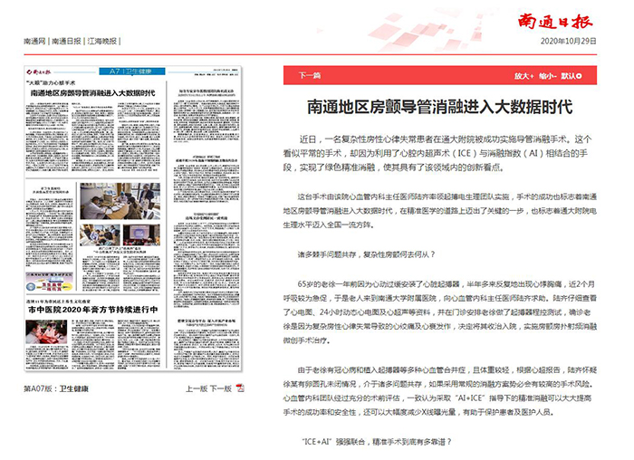南通日报:南通地区房颤导管消融进入大数据时代