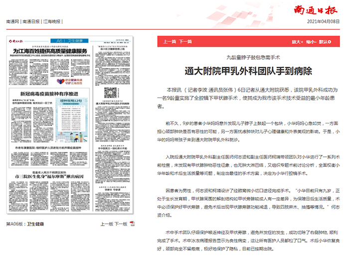 南通日报:九龄童脖子鼓包急需手术 通大附院甲乳外科团队手到病除