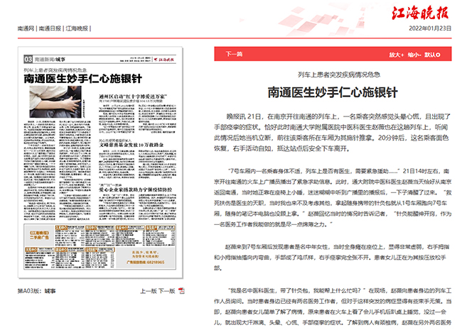 江海晚报:列车上患者突发疾病情况危急 南通医生妙手仁心施银针