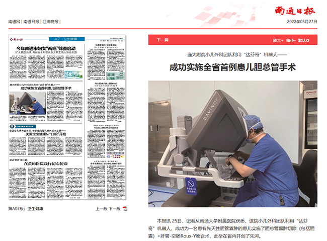南通日报:通大附院小儿外科团队利用“达芬奇”机器人成功实施全省首例患儿胆总管手术