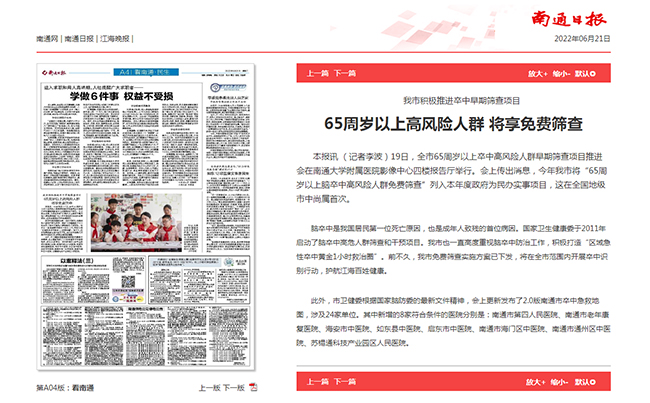 南通日报:65周岁以上高风险人群 将享免费筛查