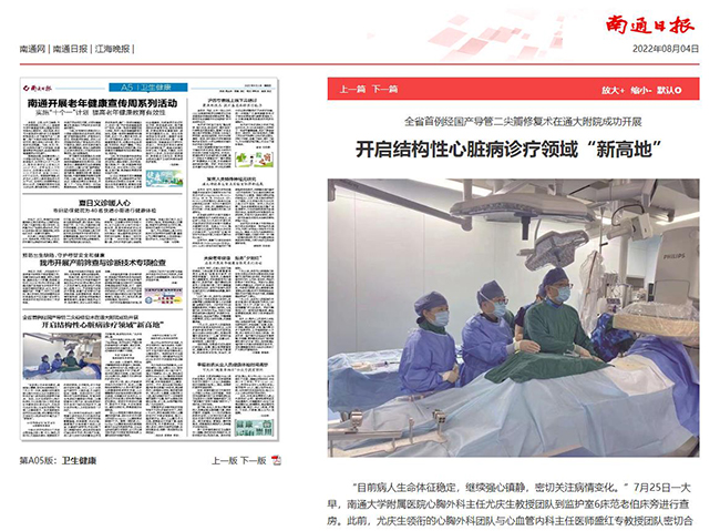 南通日报:全省首例经国产导管二尖瓣修复术在通大附院成功开展