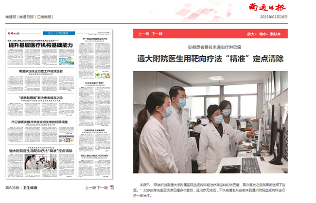 南通日报:安徽患者慕名来通治疗淋巴瘤,通大附院医生用靶向疗法“精准”定点清除