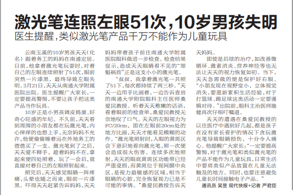 现代快报:激光笔连照左眼51次,10岁男孩失明