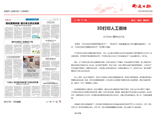 南通日报:3D打印人工假体,让71岁老人重新站立行走