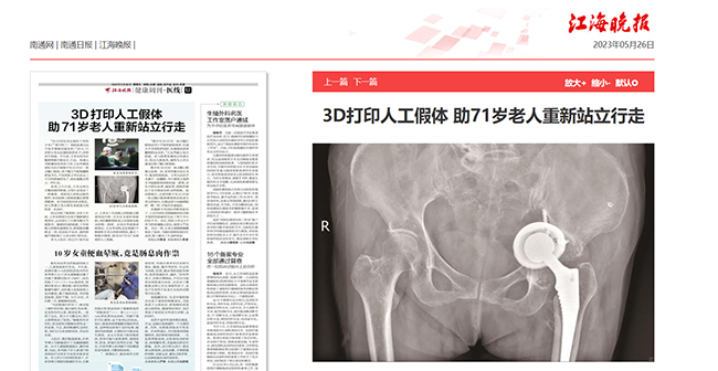 江海晚报:3D打印人工假体 助71岁老人重新站立行走