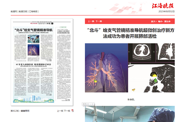 江海晚报:“北斗”给支气管镜精准导航超微创治疗新方法成功为患者开展肺部活检