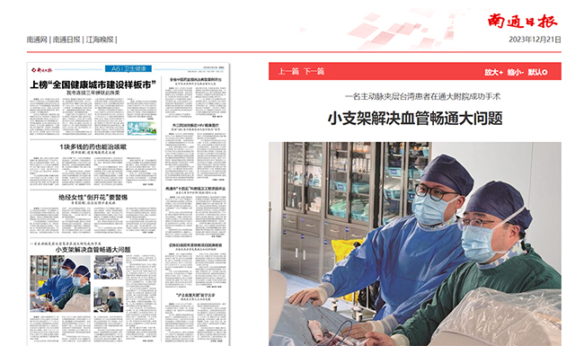 南通日报:小支架解决血管畅通大问题