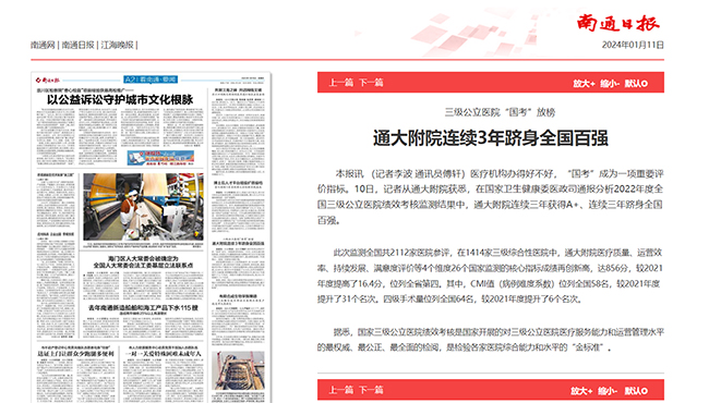 南通日报:通大附院连续3年跻身全国百强