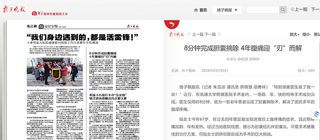 扬子晚报:8分钟完成胆囊摘除 4年腹痛迎“刃”而解