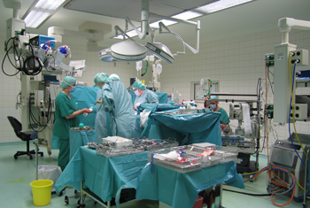 奥尔登堡手术室的布局很特别,所有的手术间均为层流手术室排在中间,两侧为辅助用房,紧靠这排手术室的南侧为一排麻醉准备间和体外循环准备间,在这些准备间的南侧为病人通道走廊(南走廊),麻醉师和灌注师也通过该走廊进入准备间继而进入手术室。每个麻醉准备间都对应一间手术室并有门与之相通,每天接台的病人都在准备间里穿刺好动静脉管路,插好气管插管(每个准备间里都有麻醉机),待前面一台手术结束后就直接推进手术室进行消毒铺单。同样体外循环准备间的灌注师将体外循环机器的管路装机完成,再将机器推进手术室。紧靠这排手术室的另一侧(北侧)是一排洗手室和耗材及器械储藏室,均有门与每间手术室相通,相邻的两间手术室合用一个洗手室。在这排房间的北侧是一北走廊,医生和护士通过此走廊进入洗手室和手术室,需要什么器械和耗材直接在手术间开门进入储藏室取出,非常便捷,整个流程都很顺畅合理。进入手术间,首先看到的是Druge的吊塔,还有Philip的监护仪,Omeda的麻醉机,Valley的电刀,史赛克的腔镜系统、Datascop的球囊反搏机、C臂机,当然还有许多我未曾见过的现代化设备比如左心辅助装置、体外循环机上的许多检测装置、冠脉流量测定仪,头灯摄像系统等。 这里手术的病人有一半是搭桥手术,通常年龄较大,搭桥病人平均年龄74岁,85岁以上的病人也在进行体外循环心脏手术。每周都有许多高难度高龄的第二次心脏手术、大血管手术、周围血管手术(他们血管外科是属于心脏外科的)复杂先心治术和人工心脏植入术(每个人工心脏价值14万欧元)。有许多新技术和新方法值得我们学习,因此大开眼界。 手术通常在上午8:15开始,每个手术间每天3台左右的体外循环手术,正常情况下第一台体外循环下搭桥(搭四根桥)在11:00送病人,第二台在1:30送病人,第三台通常安排比较复杂的手术如大血管手术或二次搭桥或二次换瓣手术。每天手术通常在每天下午4—5点结束,两周中只有一天有一台夹层动脉瘤行胸腹主动脉置换深低温停循环的手术做到夜里11点。他们手术非常熟练,每台手术之间的衔接也非常好。 尤庆生
