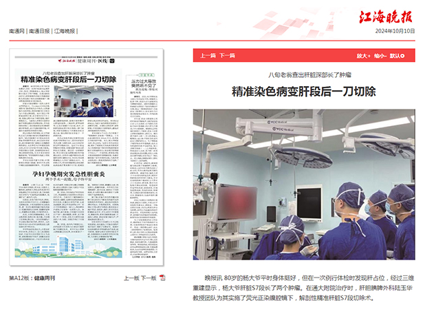 江海晚报:八旬老翁查出肝脏深部长了肿瘤,精准染色病变肝段后一刀切除