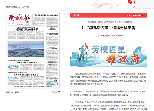 南通日报:全国先进工作者、通大附院普外科主任王鹏教授:让“单孔腹腔镜”造福更多患者
