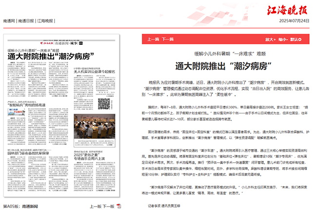 江海晚报:缓解小儿外科暑期“一床难求”难题 通大附院推出“潮汐病房”