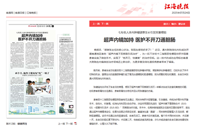 江海晚报:七旬老人体内肿瘤肆意生长引发双重梗阻 超声内镜加持 医护不开刀通胆肠