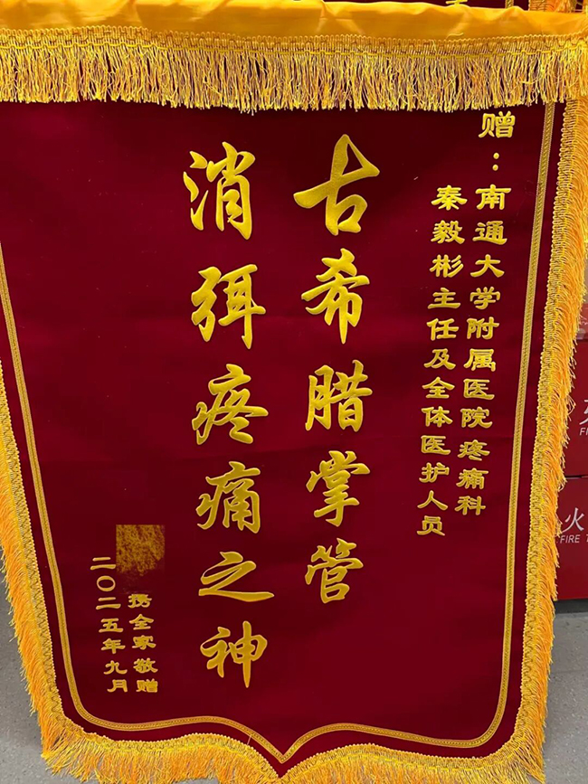 术后,陈奶奶腿部疼痛基本消失,当晚即能自主平卧入睡,精神和食欲也明显改善。为表达感谢,陈奶奶的家人特地送来锦旗,一再向通大附院疼痛科致谢。