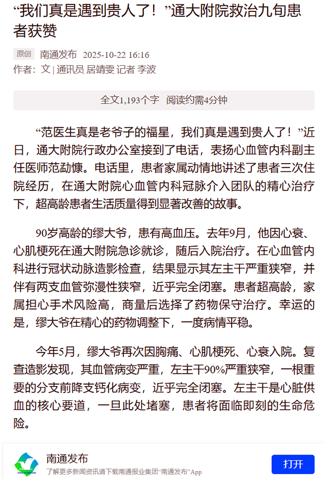 南通发布:“我们真是遇到贵人了!” 通大附院救治九旬患者获赞