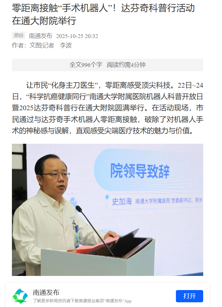 南通发布:零距离接触“手术机器人”!达芬奇科普行活动在通大附院举行