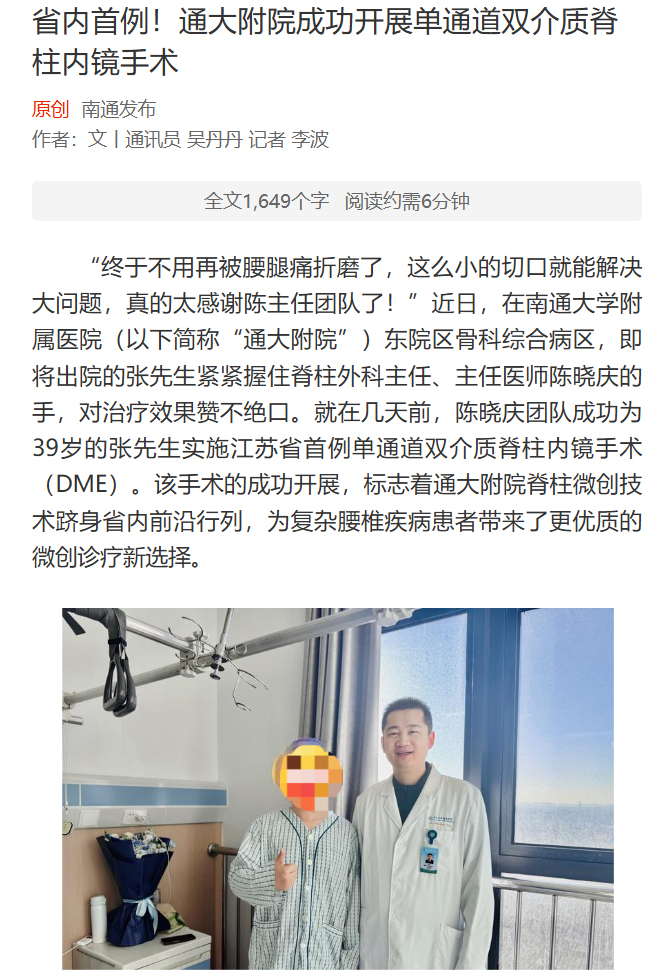 南通发布:通大附院成功开展单通道双介质脊柱内镜手术