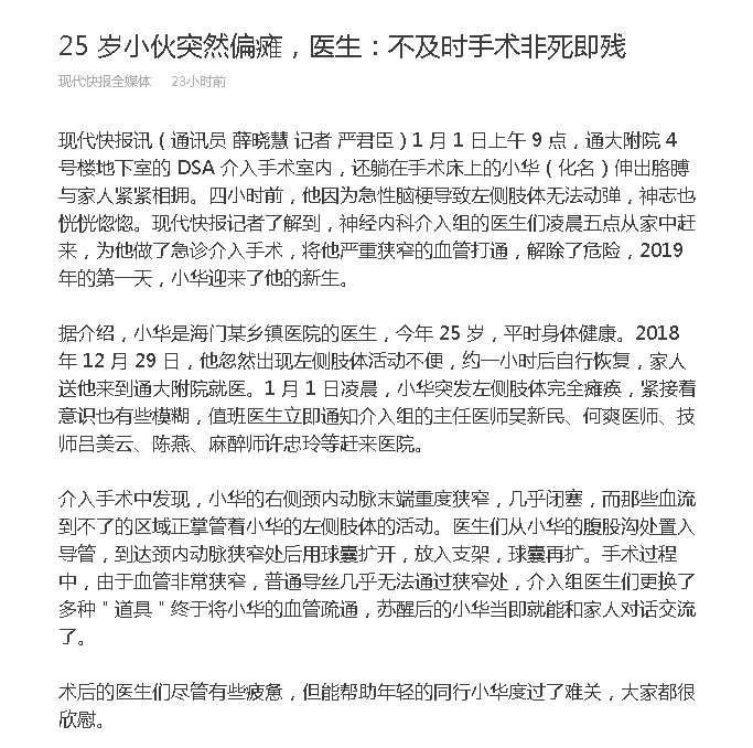 现代快报:25岁小伙突然偏瘫,医生:不及时手术非死即残