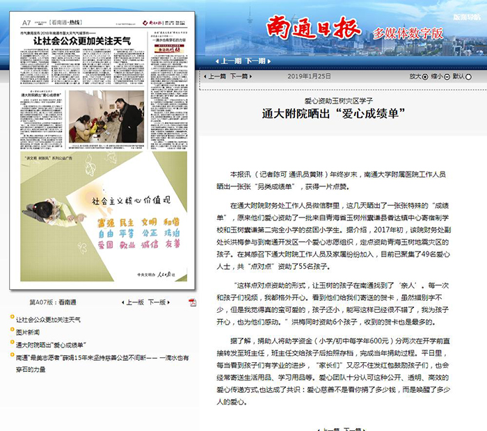 南通日报:爱心资助玉树灾区学子 通大附院晒出“爱心成绩单”