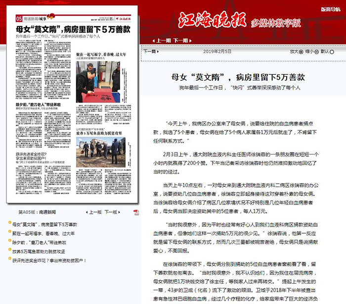 江海晚报:母女“莫文隋”,病房里留下5万善款